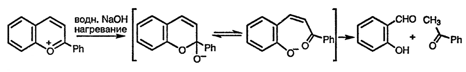 Для получения простых аддуктов необходимо строго контролировать условия реакции, поскольку в более жёстких условиях при взаимодействии со щёлочью наблюдается раскрытие цикла и последующее расщепление связи углерод — углерод в результате процессов ретро-альдольного типа. Такие превращения обратны используемым для получения катионов 1-бензопирилия (разд. 9.3.1.) и ранее использовались для структурного изучения антоцианиновых пигментов цветов.