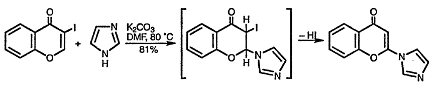 Взаимодействие 3-иодхромона с имидазолом проходит через последовательные стадии присоединения — элиминирования, как показано ниже, и приводит к продукту замещения по положению C(2) [43].