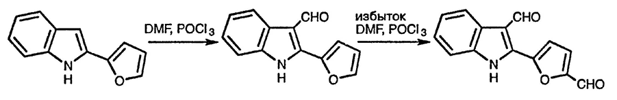 Индолы лишь немногим менее активны в реакциях электрофильного замещения по сравнению с пирролами, и такие реакции проходят по β-положению гетероциклического фрагмента. Скорости ацетилирования в условиях реакции Вильсмейера (N,N-диметилацетамид — фосген) индола и пиррола соотносятся как 1:3 [24]. В противоположность пирролу, для индола наблюдается очень высокая региоселективность при реакциях электрофильного замещения; так, при ацетилировании в условиях реакции Вильсмейера соотношение скоростей атаки по β- и α-положениям равно 2600:1. Индол вступает в реакции с электрофилами по β-положению в 5×1013 раз быстрее, чем бензол [25]. Иллюстрацией различия в реакционной способности индола и фурана может служить приведённая ниже [26] реакция формилирования.