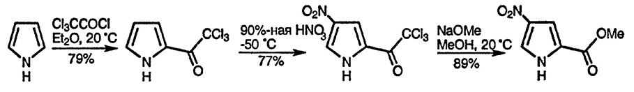 Ацилирование 3-ацилпирролов, легко получаемых в результате гидролиза 1-фенил-сульфонил-3-ацилпиролов, приводит к образованию 2,4-диацилированных пирролов [43], а формилирование метилового эфира пиррол-2-карбоновой кислоты — к 5-формильному производному [44]. Для получения пиррол-3-карбоновой кислоты можно эффективно использовать два метода: первый заключается в окислении 3-ацетил-1-фенилсульфонилпиррола [45], а второй — в гидролизе 1-тритил-3-трифторацетилпиррола и последующем удалении тритильной группы.