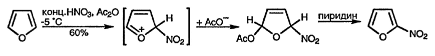 Чувствительность фуранов не позволяет использовать концентрированную кислотную нитрующую смесь. При взаимодействии фурана или замещённых фуранов [6] с ацетилнитратом первоначально образуются неароматические аддукты, в которых образованию продуктов замещения препятствует процесс нуклеофильного присоединения ацетата к катионному интермедиату, обычно [7] по положению 5 [8].