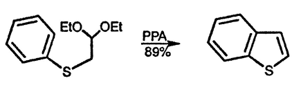 Чтобы синтезировать бензотиофены [57], не замещённые в гетероциклическом фрагменте, исходят из ацеталя арилтиоацетальдегида, который в свою очередь получают из ацеталя бромацетальдегида и тиофенола. Аналогично получают 2,3-незамещённые бензофураны [58].